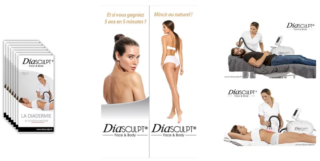 L’équipe marketing et commerciale s’applique à créer et actualiser régulièrement les outils d’aide à la vente pour vous permettre d’afficher et diffuser l’offre de soin anti-âge et minceur de Diasculpt.